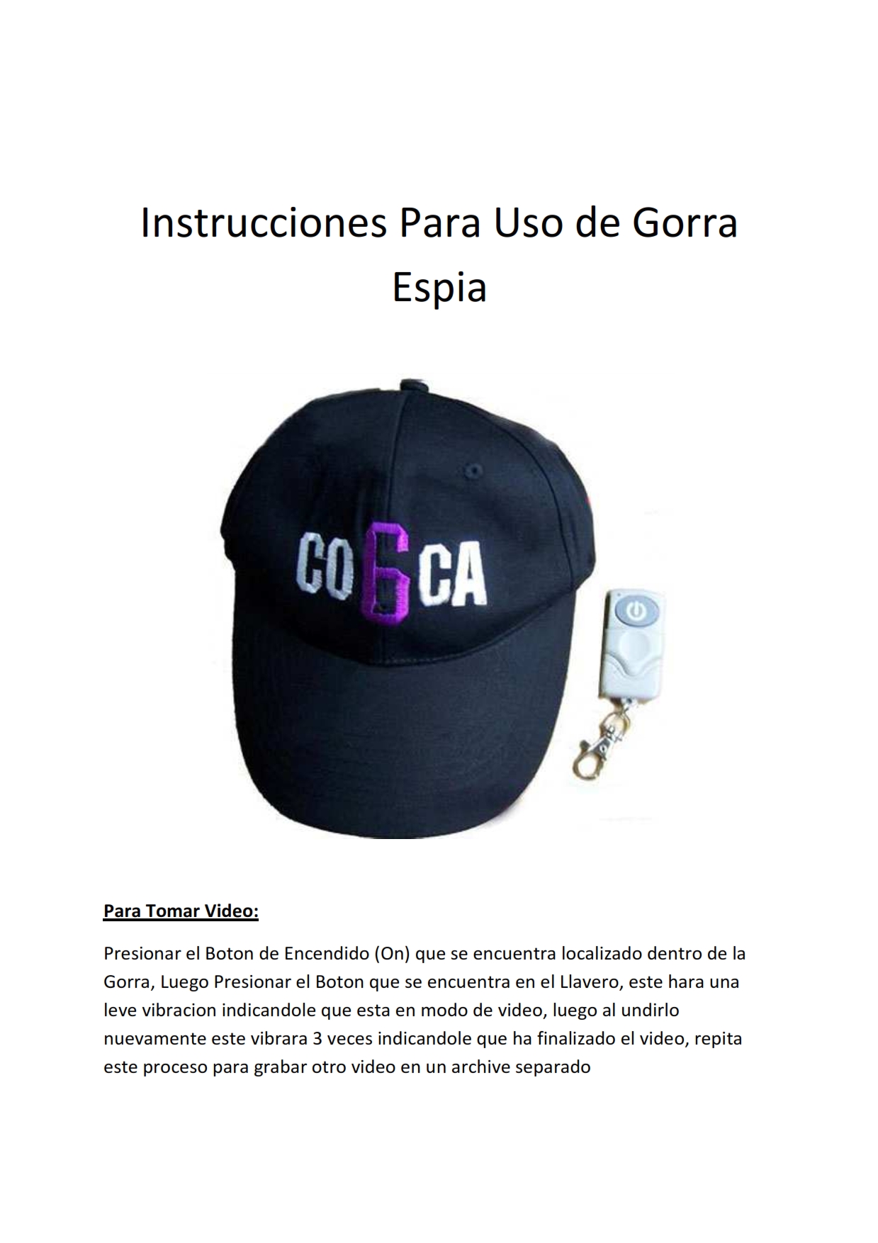 Se trata de una típica gorra, que en su frente tiene una lente de 1 mm que filma con alta resolución y plano gran angular. La tela está trabajada para que no se arrugue y pase totalmente de forma inadvertida. El espesor de la microcámara es ultra delgado y esto permite utilizarla con comodidad como si no hubiera nada.