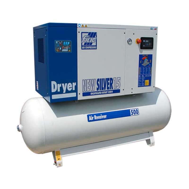 De FIAC Investigación y Desarrollo, una nueva gama de compresores de tornillo de bajo ruido llamados New Silver nace para satisfacer las demandas de los pequeños generadores de aire comprimido con baja potencia de 5,5 a 50 HP: simple, económico, pero tecnológicamente avanzados. New Silver es la solución ideal para clientes que necesitan una estación de aire completo que es fácil de usar, conveniente para la operación continua y constante en el tiempo