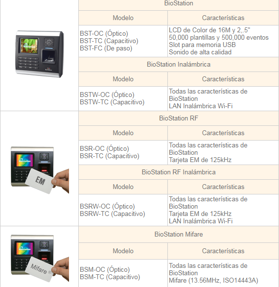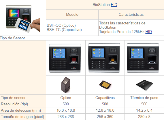 Varios modelos disponibles: sólo sensor de huella, proximidad HID, proximidad Mifare; sensor óptico