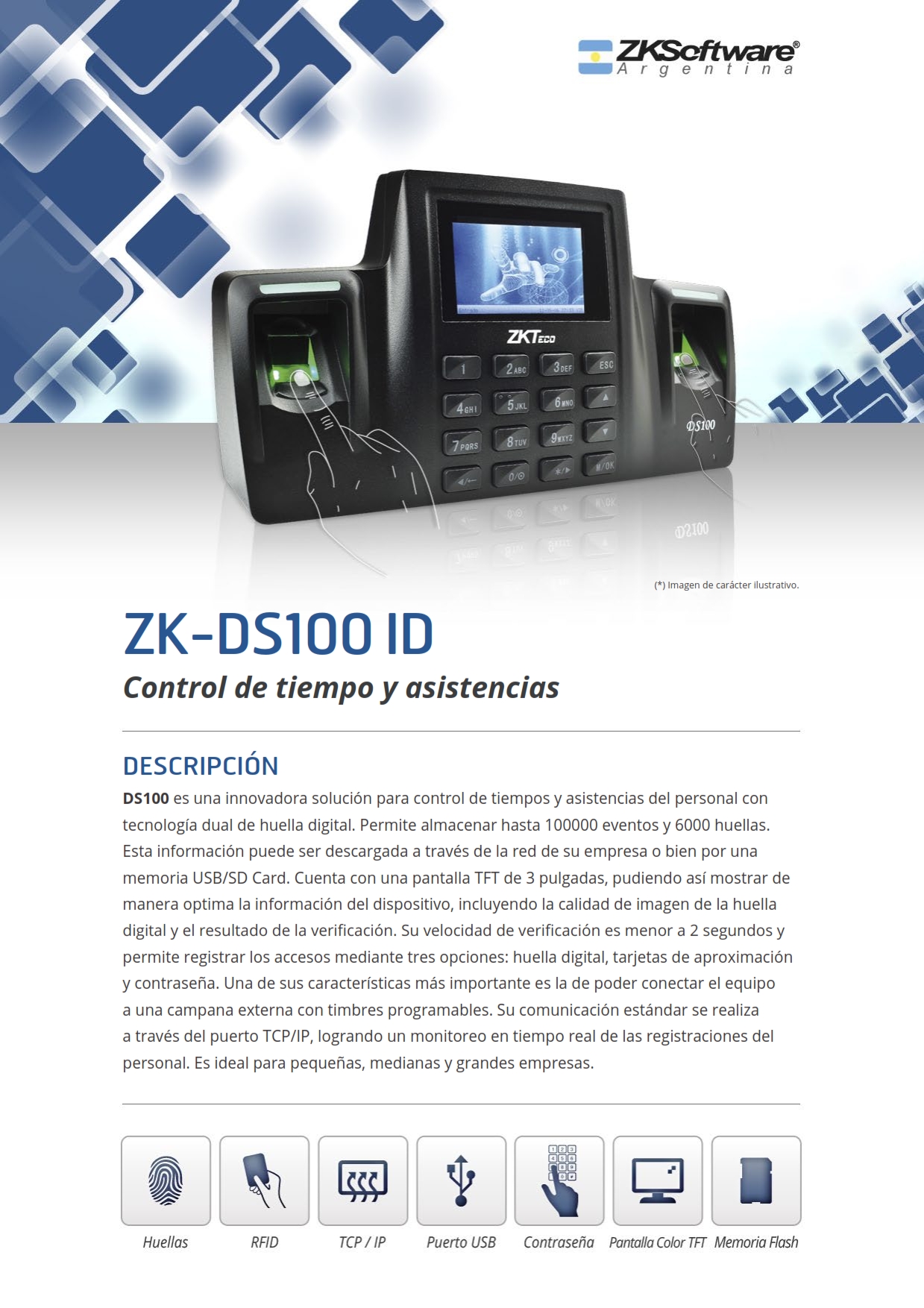 DS100 es una innovadora solucion para control de tiempos y asistencias del personal con tecnologia de dual de huella digital. Permite almacenar hasta 100000 eventos y 3000 huellas. Esta informacion puede ser descargada a traves de la red de su empresa o bien por una memoria USB/SD Card. Cuenta con una pantalla TFT de 3 pulgadas, pudiendo mostrar de manera optima la informacion del dispositivo, incluyendo la calidad de imagen de la huella digital y el resultado de la verificacion.