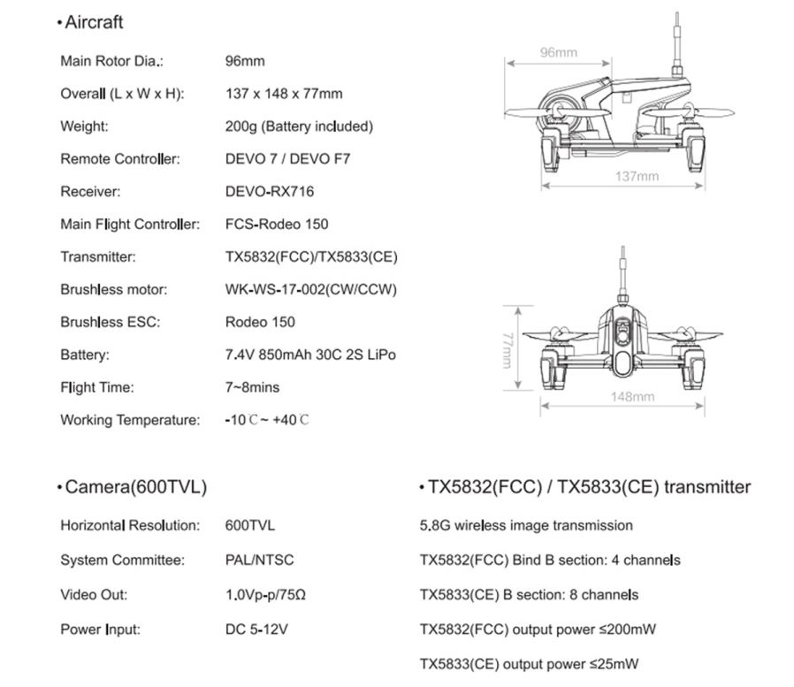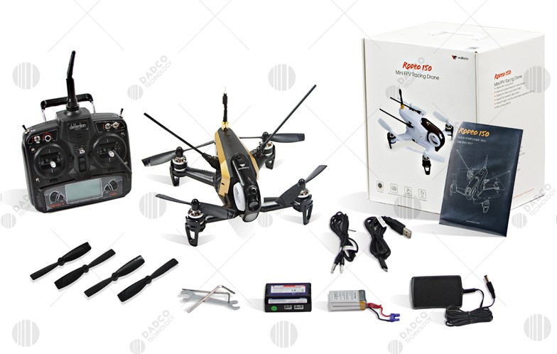 Contenido del Paquete: 1 x Rodeo 150 Racing Drone, 1 x Cámara 600TVL, 1 x Batería 7.4V 800mAh Li-Po, 1 x Cargador, 1 x Manual del Usuario en Inglés