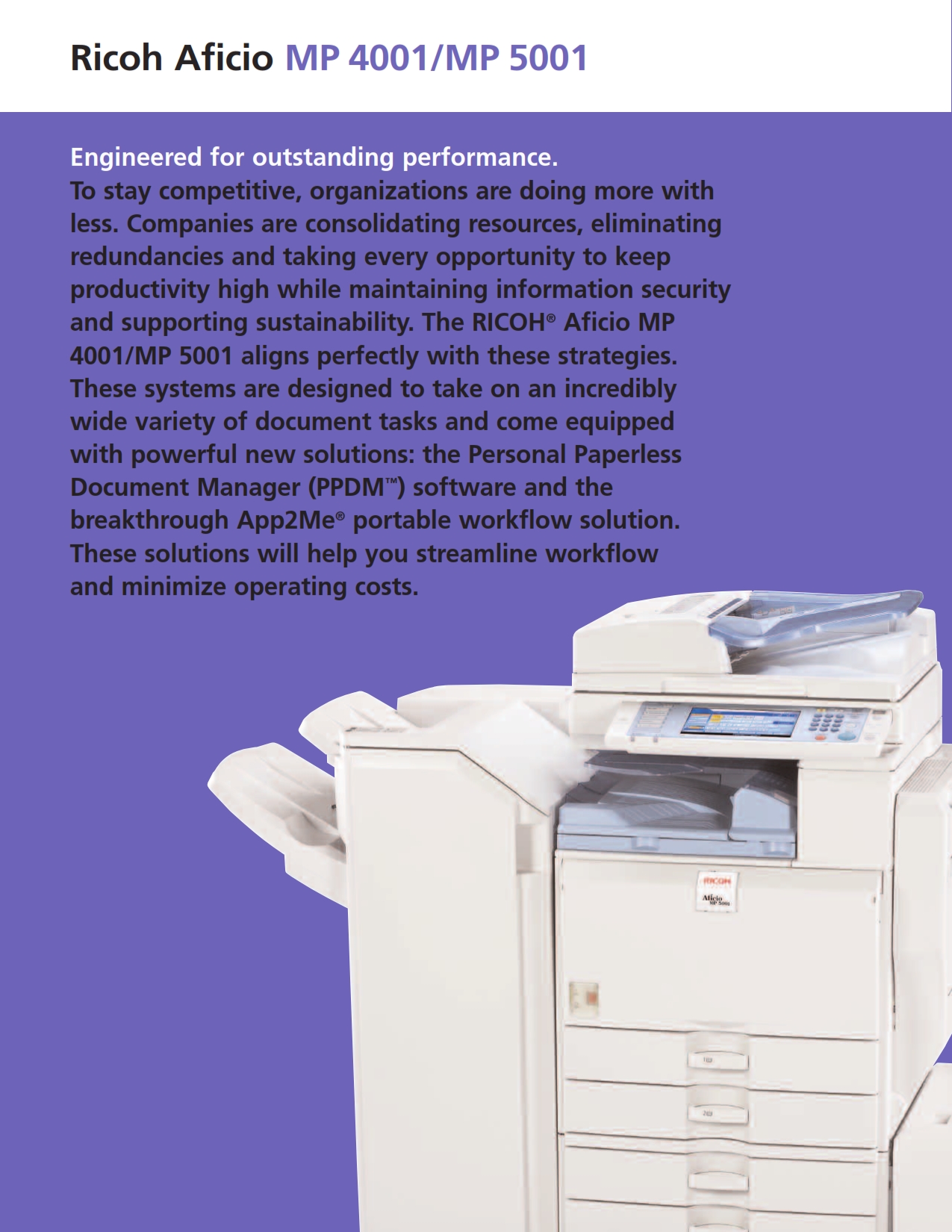 MP 4001 puede imprimir, copiar, escanear a color, enviar y recibir faxes. Además, trabaja a una velocidad de 40 páginas por minuto con una resolución de impresión de 600 dpi. De este modo se aumenta la eficiencia de su negocio y se ha mejorado la facilidad de uso con la nueva plataforma de software App2Me de Ricoh. Personalice la forma en la que interactuará con la MFP mediante diversos widgets descargables. Nunca había sido tan sencillo utilizar un único dispositivo para todo y ahorrar costes y tiempo.