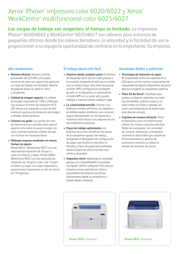 La Xerox Workcentre 6027V_NI es un completo dispositivo 4 en 1 con fax y wifi capaz de gestionar las necesidades de cualquier usuario con una gran calidad de impresión.