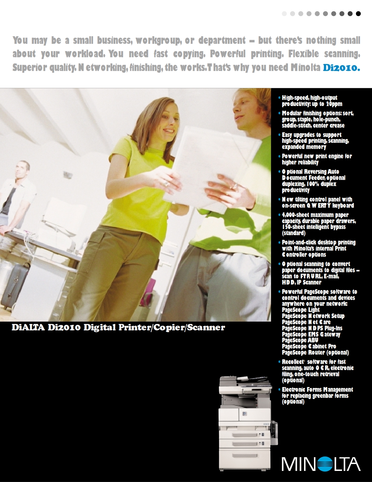 Konica Minolta lanzó la Di2010 Fue diseñado para pequeños grupos de trabajo con un ciclo de trabajo mensual de 60.000 impresiones. Las primeras copias se imprimen en 5,3 segundos y la velocidad de multi-copia es de 20 páginas por minuto. La Di2010 bizhub una copiadora estándar con impresora y escáner funciones opcionales.