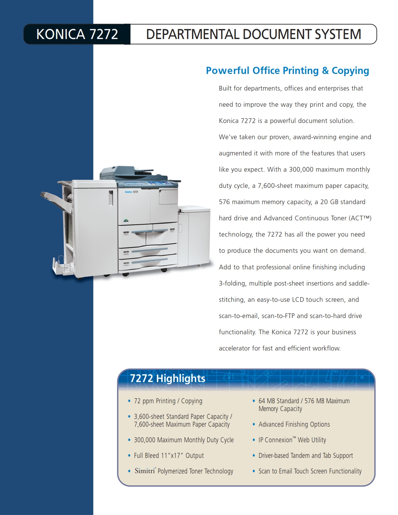 Impresión y velocidades de copia de 72 páginas por minuto (ppm) y 55 ppm, respectivamente, de exploración en 70 originales por minuto (opm) con un contador integrado de exploración, y de alta calidad consistente salida con la tecnología Simitri ® tóner polimerizado de Konica Minolta. Capacidad de papel se ha mejorado con la adición de una cuarta bandeja en el cuerpo principal, el aumento de la capacidad de papel estándar de 3.600 hojas, mientras que el mantenimiento de dos bandejas universales ajustables por el usuario con un tamaño máximo de papel de 12 "x 18". Una bandeja opcional de 4.000 hojas de gran capacidad (LCT) también está disponible para aumentar la capacidad máxima de carga del producto para 7600 hojas.