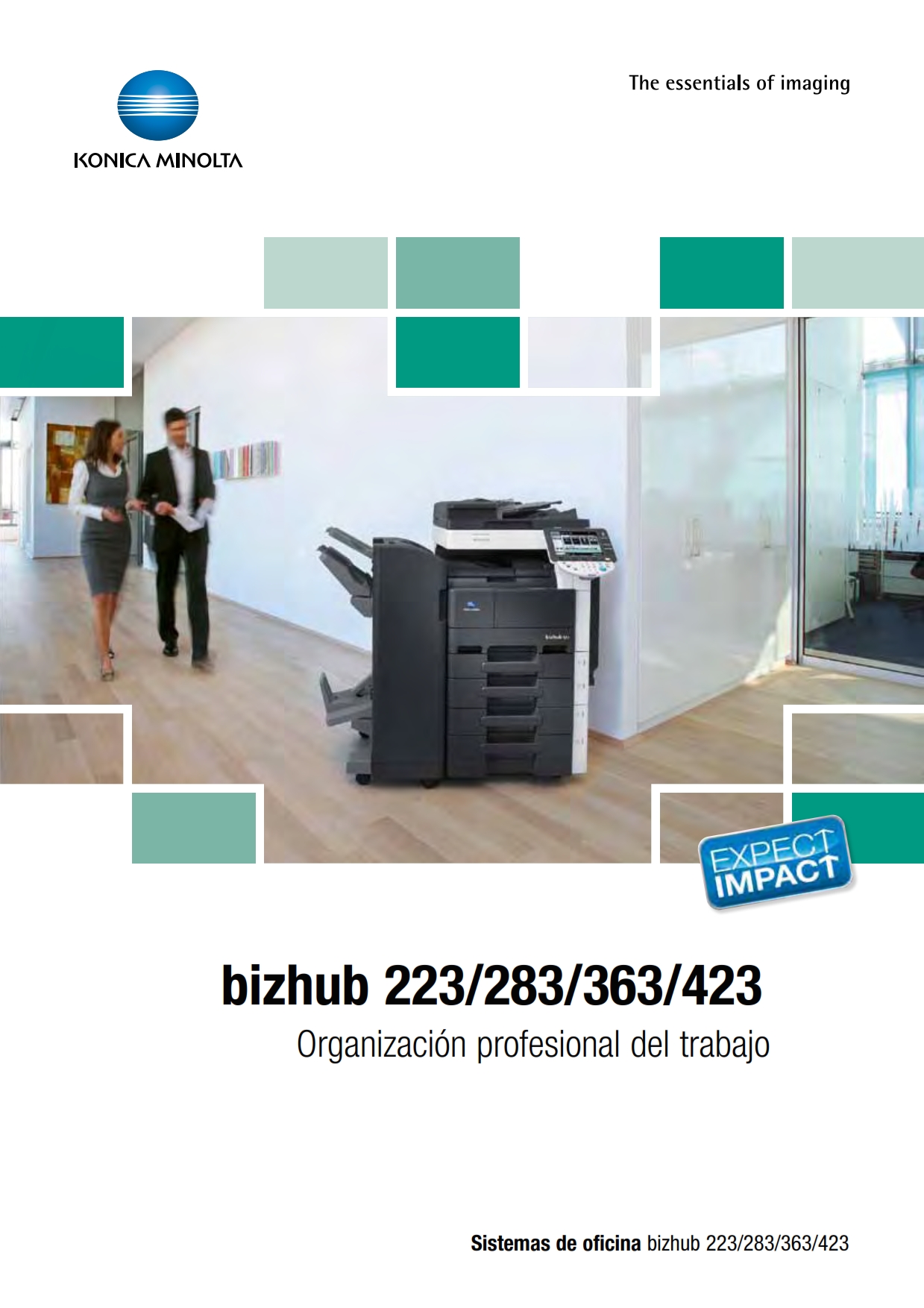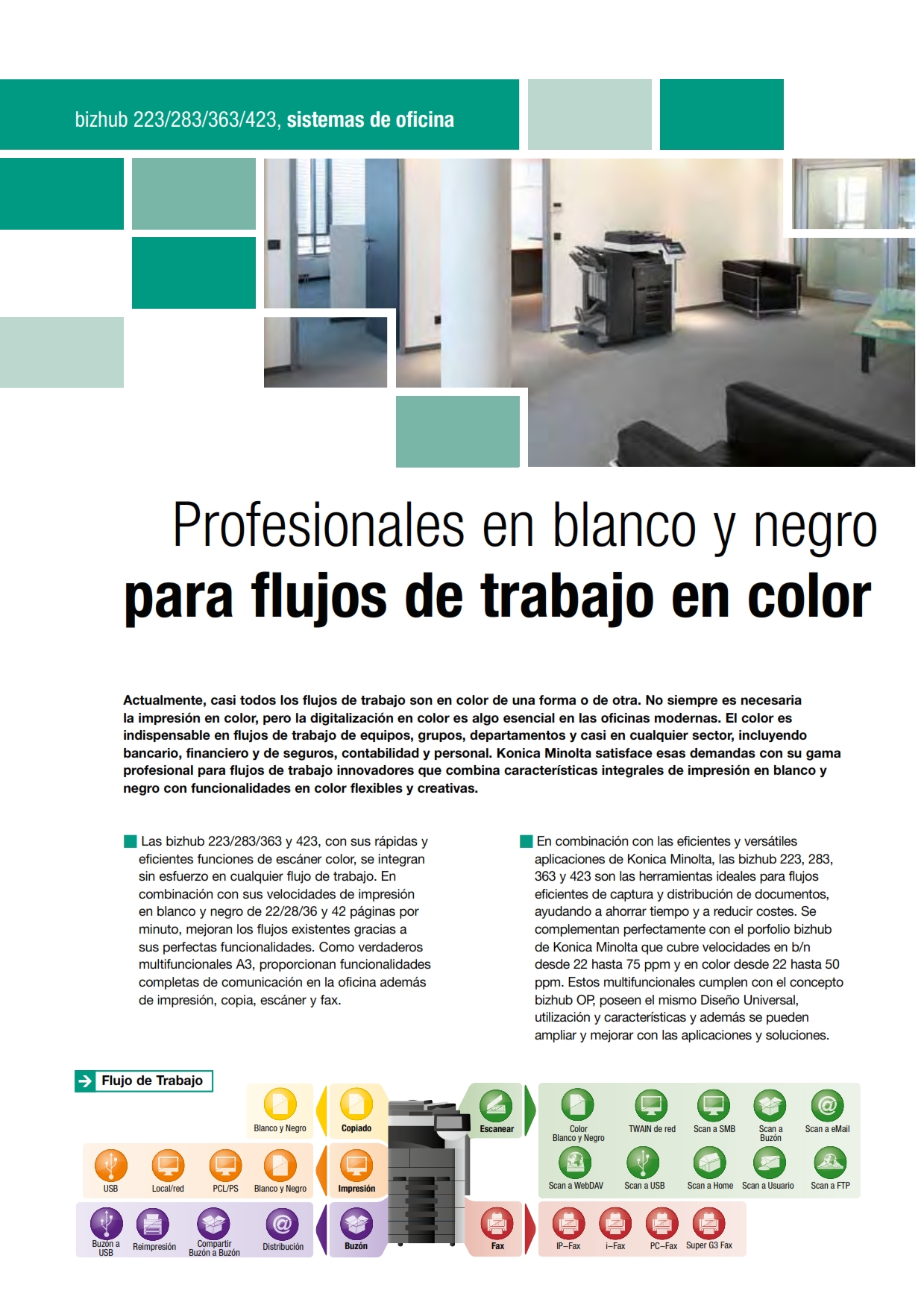 Konica Minolta ha desarrollado sus nuevos multifuncionales pensando en oficinas que no siempre necesitan imprimir en color, pero en las que a veces es indispensable. Asi pues, los modelos bizhub 223, 283, 363 y 423 ofrecen tanto una alta calidad en la copia, impresión y fax en blanco y negro como versatiles funciones de escaneado a color. Combinado con las aplicaciones de software de Konica Minolta, los nuevos sistemas de oficina son ideales para la eficiente captura de documentos y la distribución de los flujos de trabajo. Esto ayuda a reducir tiempos y costos en grupos y departamentos en prácticamente cualquier ambiente corporativo, como por ejemplo contabilidad, control y personal.