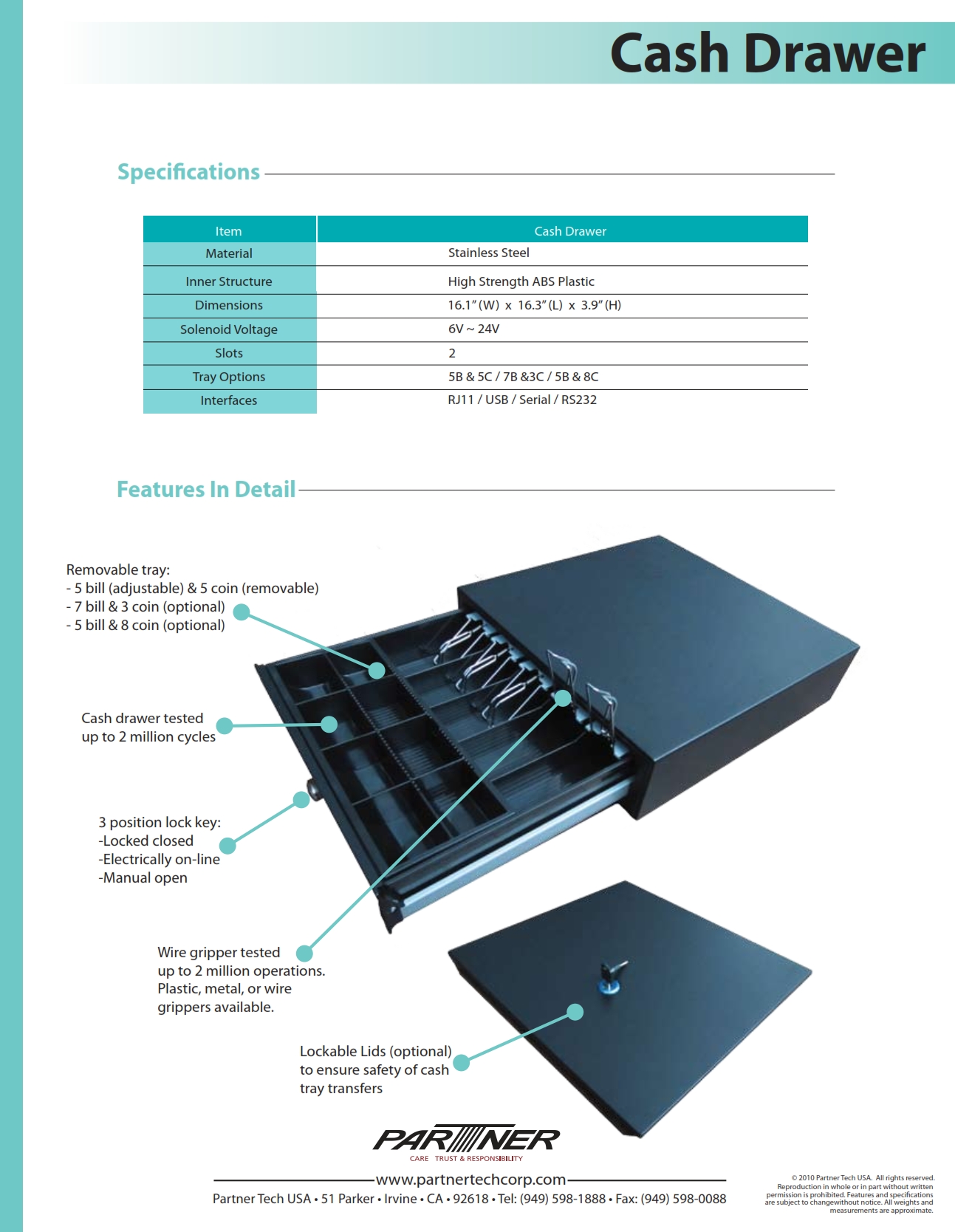 es el modelo del cajón o gaveta de dinero de la marca PARTNER cuya función es proteger y mantener ordenados los billetes,