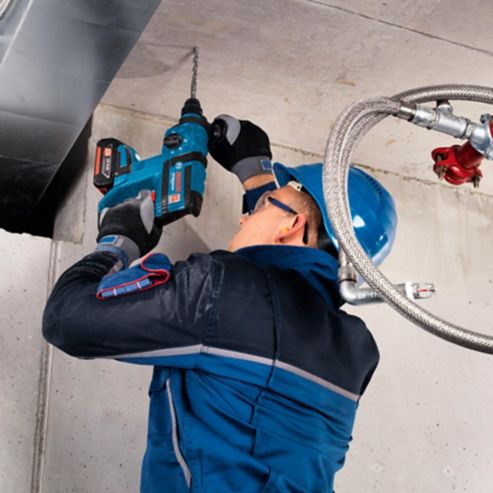 Concebido para perforar y cincelar en hormigón, mampostería, madera y metal. Es compatible con varios aspiradores y con las baterías y cargadores Bosch Professional 18 V (Flexible Power System).