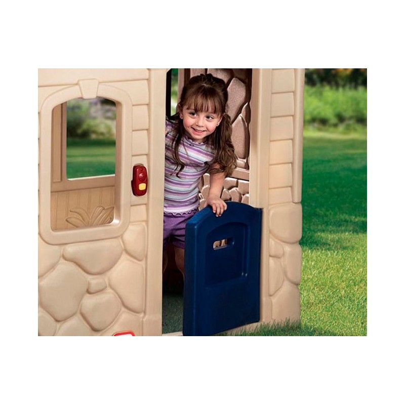 Linda casita con timbre y accesorios de juegos, los niños podrán jugar en la mesa con bancas que incluye. Esta casita tiene paredes labradas que la hace mas divertida y en su interior tiene una cocina básica con perillas.
