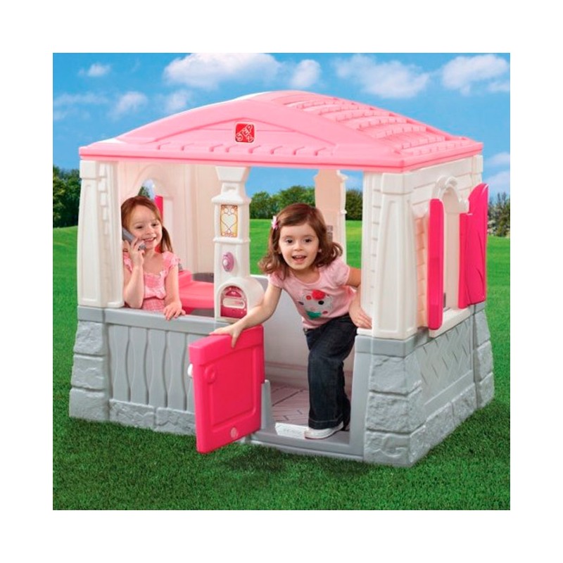 Linda casita recreativa con piso, que evita el contacto con el suelo su diseño abierto proporciona la vista fácil a los niños en el juego, con buzón y timbre con sonidos. Con mesa y dos asientos. Recomendable para niños de 1.5 años a mas.