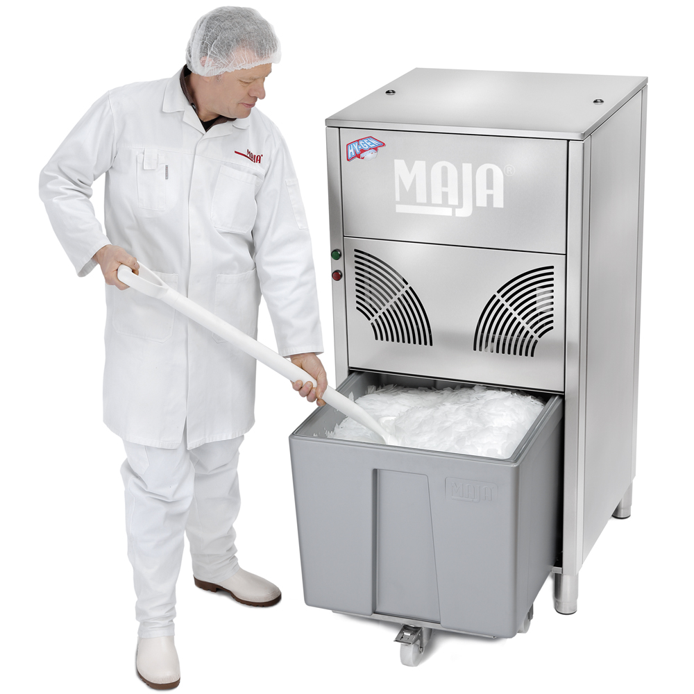Fabricador de hielo en escamas, compacto y listo para funcionar, incluye unidad condensadora y depósito móvil para almacenar y transportar aprox. 50 kg de hielo en escamas MAJA. Además equipado con sistema auto-limpieza patentado MAJA-SCS.