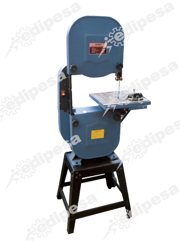 Esta máquina se compone de un bastidor, en forma de cuello de cisne, soportando dos volantes equilibrados y superpuestos en un mismo plano vertical y sobre los cuales se encierran una hoja de sierra sinfín llamada cinta.