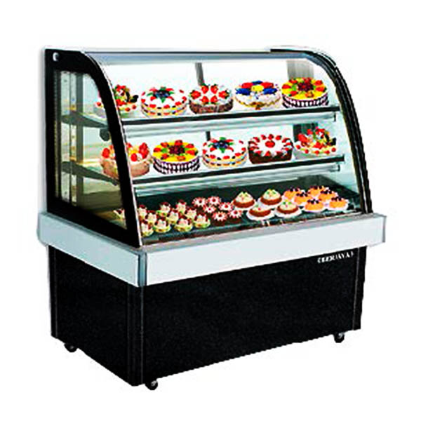 Berjaya Cream Cake Cabinet CCS 18SB13-2FB es un diseño de gabinete de vidrio curvo, que ahorra espacio y lujo. Los gabinetes son relativamente pequeños en tamaño de 1800 mm de largo, 730 de profundidad, altura de 1250.